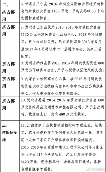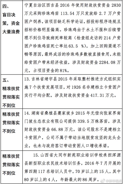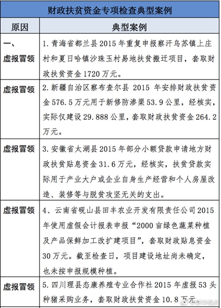 “發(fā)現(xiàn)一起、查處一起、絕不姑息!”財政部監(jiān)督檢查局有關(guān)負責人指出,此次檢查發(fā)現(xiàn)了一批違法違規(guī)問題,本著“零容忍”態(tài)度已進行了嚴肅處理。從檢查發(fā)現(xiàn)問題中的一些典型案例看,虛報冒領(lǐng)、擠占挪用、違規(guī)招投標、盲目決策導(dǎo)致資金大量浪費、精準扶貧貫徹落實不到位是當前濫用扶貧資金的主要問題所在。