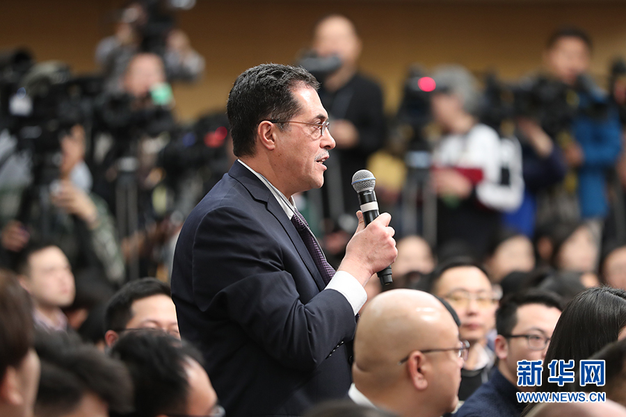 十二屆全國人大五次會議新聞中心于3月8日(星期三)10時在梅地亞中心多功能廳舉行記者會,邀請外交部部長王毅就“中國的外交政策和對外關系”的相關問題回答中外記者的提問。圖為半島電視臺記者提問。新華網/中國政府網 翟子赫 攝