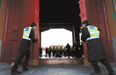 昨天下午,單霽翔與其他“故宮人”一起,進(jìn)行年度最后一次開放區(qū)域清場(chǎng)封門的檢查,并見證故宮關(guān)上大門。