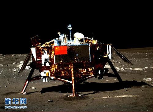 資料圖:嫦娥三號著陸器及器載五星紅旗圖片。該圖是由月球車上全景相機拍攝的。新華社發(國防科工局供圖) 圖片來源:新華網