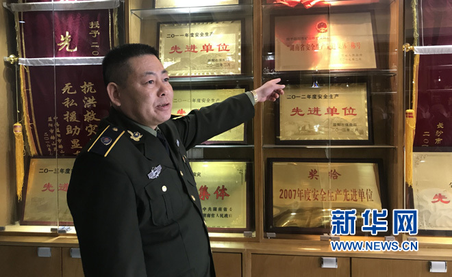 邵陽市礦山救護支隊隊長王建華向記者介紹該隊獲得的各項榮譽。新華網于子茹攝