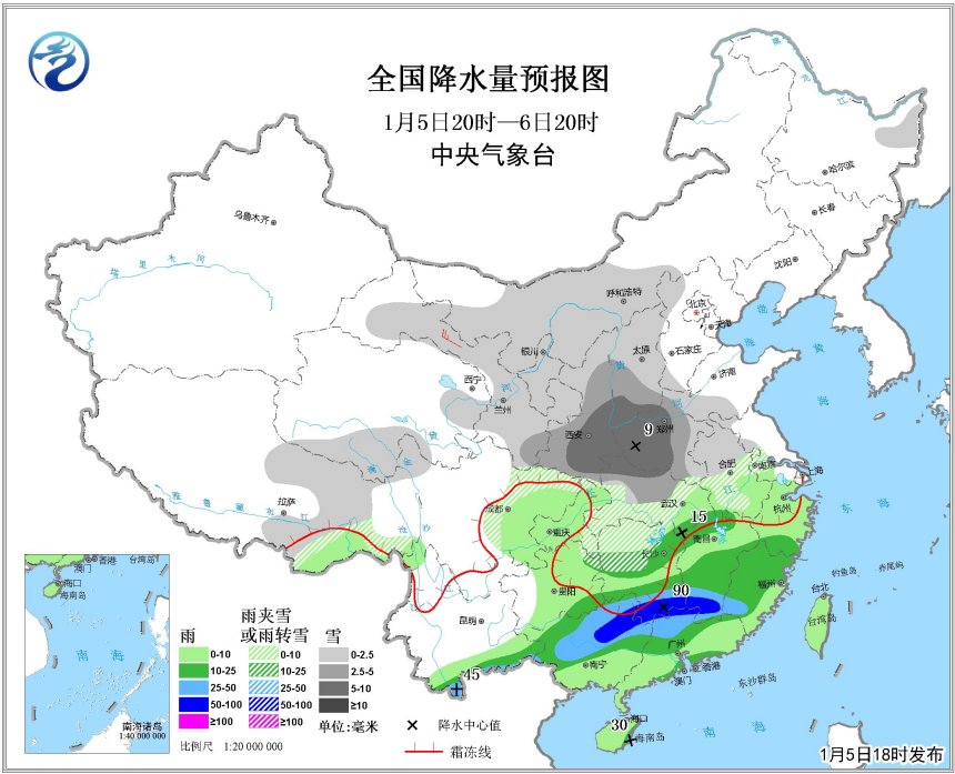 6日白天至8日,江南東部和南部、華南大部有中到大雨,其中湖南東南部、江西南部、福建西部和南部、廣東北部、廣西北部等地的部分地區(qū)有暴雨、局地大暴雨(累計雨量80~150毫米)。貴州中北部和湖南西北部局地有凍雨。