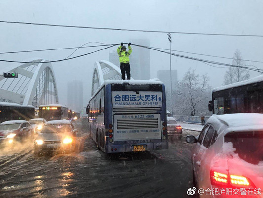 通訊電纜被壓落導致交通癱瘓 執(zhí)勤協(xié)警爬上公交車頂 用雙手托舉電纜線10多分鐘 城管 暖心! 南京城管掃雪打通道路 兩歲小女孩跑過來說“謝謝叔叔” 環(huán)衛(wèi)工人 擰干濕透的襪子