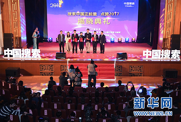 1月19日,“搜索中國正能量點贊2017”活動獲獎企業(yè)代表在頒獎典禮上領(lǐng)獎。當(dāng)日,由中國搜索創(chuàng)意策劃,聯(lián)合多家中央重點新聞網(wǎng)站和北京大學(xué)新媒體研究院共同舉辦的“搜索中國正能量點贊2017”大型網(wǎng)絡(luò)宣傳活動揭曉典禮在北京舉行。此次活動歷時兩月,征集評選出“精彩中國、創(chuàng)新中國、美麗中國、公益中國、品牌中國”五大系列23個熱搜、點贊榜單。新華社記者 李賀 攝
