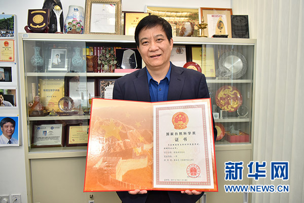 1月18日,唐本忠向記者展示他獲得的2017年度國家自然科學獎一等獎證書。新華社發 (王璽 攝)
