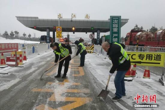 資料圖:江西高速公路工作人員在收費站通道進行掃雪除冰作業(yè)。鐘欣 攝
