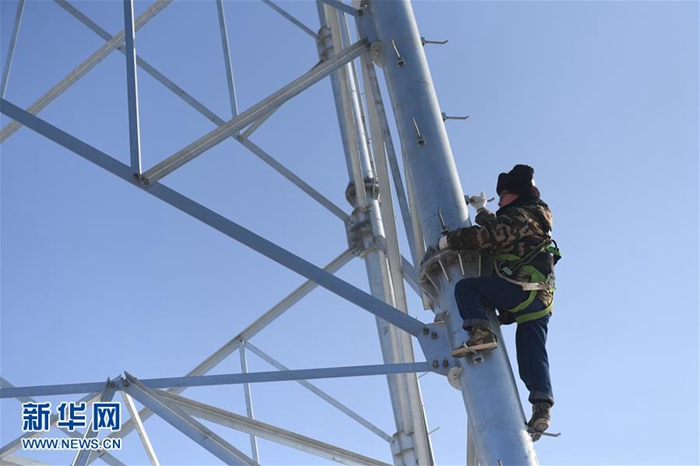 1月26日,國家電網(wǎng)長春供電公司輸電運檢室?guī)щ娮鳂I(yè)班班長楊忠武徒手爬上高壓線塔。新華社記者 張楠 攝