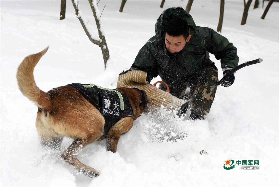1月27日,武警安徽總隊機動支隊警犬班班長王營廣帶領警犬“魯克”進行撲咬訓練。