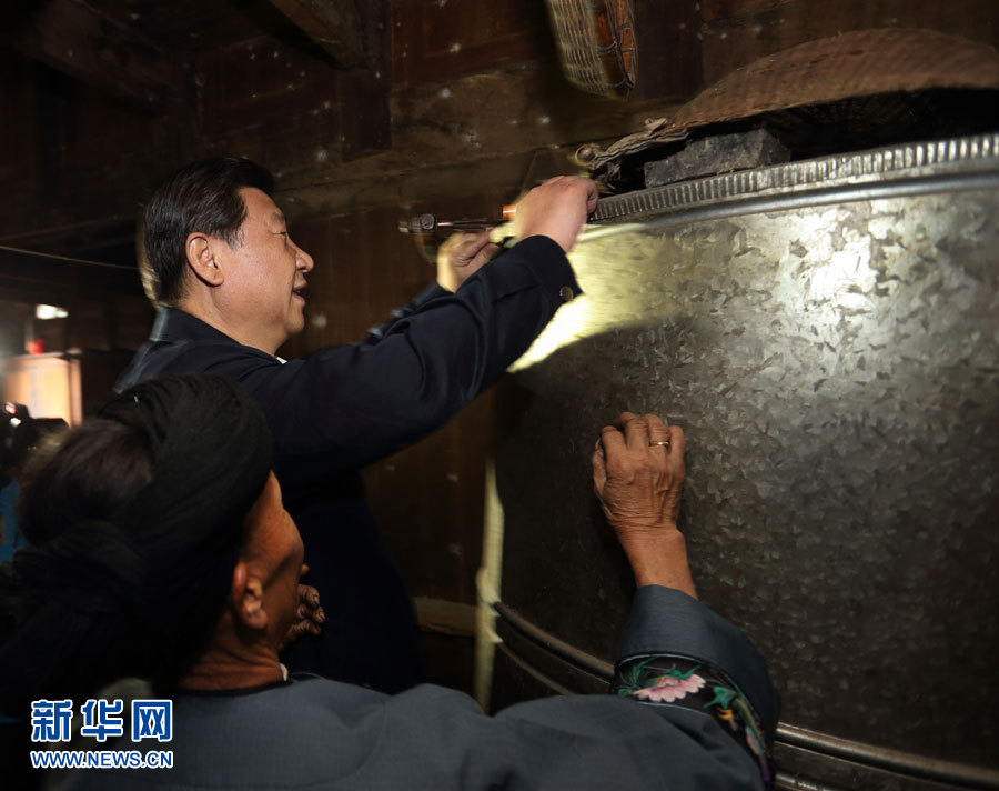 在河北阜平龍泉關鎮駱駝灣村困難戶唐榮斌家,習近平拿起桌上的藥瓶仔細查看,囑咐老人多多保重身體。