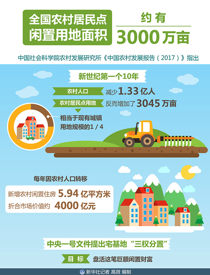 這是全國農村居民點閑置用地大致面積。中國社會科學院農村發展研究所《中國農村發展報告(2017)》指出,新世紀第一個10年,農村人口減少1.33億人,農村居民點用地反而增加了3045萬畝,相當于現有城鎮用地規模的1/4。每年因農村人口轉移,新增農村閑置住房5.94億平方米,折合市場價值約4000億元。