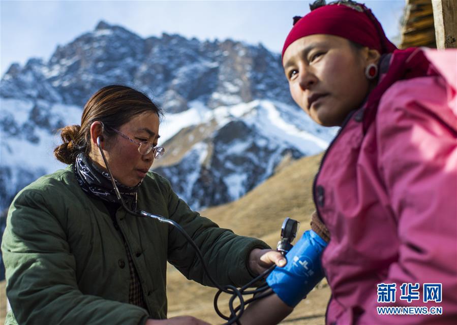 巡診隊里唯一的女醫生張紅英(左)在為牧民檢查身體(2017年12月18日攝)。新華社記者 江文耀 攝
