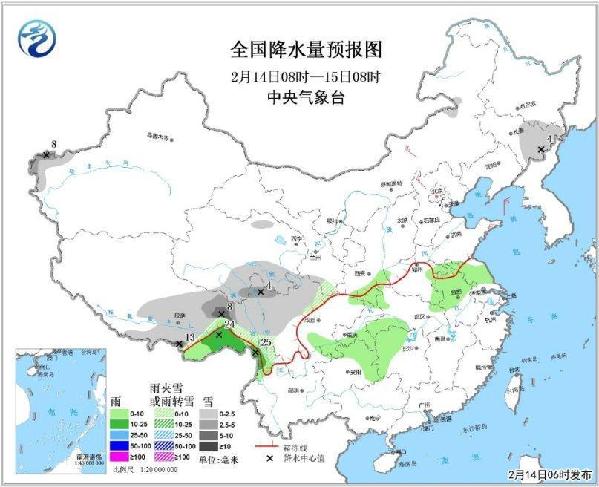 14日08時至15日08時,西藏中東部、青海東南部、川西高原、吉林東部等地有小到中雪或雨夾雪,其中西藏東部局地有大雪或暴雪;貴州東部、湖南西北部、蘇皖中北部等地有小雨,西藏東南部、云南西北部有小到中雨。內蒙古中部、河北北部等地有4~5級風。內蒙古中東部、華北北部等地有4~5級風,遼東半島有6~7級風。南海東北部和西南部將有6~7級、陣風8級的東北風或偏東風,南海東南部將有7~8級、陣風9~10級風。