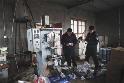 去年1月16日,執法人員勘查天津獨流鎮一造假窩點,灌裝機“吐出”勾兌好的假醋。資料圖片/新京報記者 大路 攝