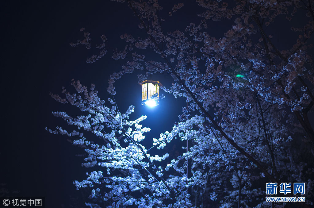 3月25日,揚州鑒真大道,夜幕下的櫻花,在燈光月色的輝映下別有一番意境。(圖片來源:視覺中國)