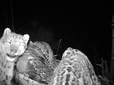 當人們趕到后,雪豹已經(jīng)不在現(xiàn)場。于是,工作人員在牦牛尸體附近的樹上布下了兩臺紅外相機,捕捉到了前面所述的畫面?!拔覀冊诎惭b機器時,雪豹就在二十米開外的一塊巨石背后,我看到了它放光的眼睛?!?/p>