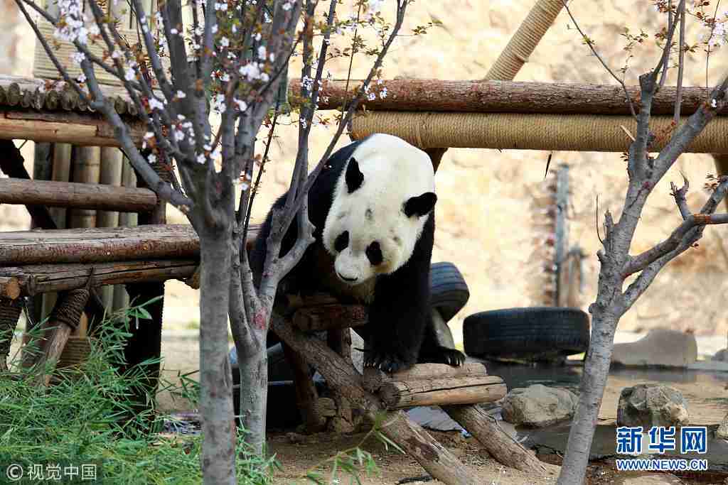 3月27日,山東濟(jì)南春暖花開,動物園內(nèi)熊貓?jiān)趫@中散步吃美食享受春天美好陽光。(圖片來源:視覺中國)