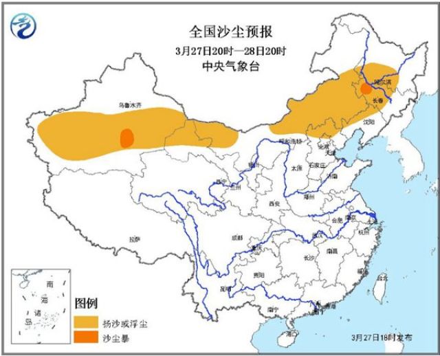 預計27日20時至28日20時,受大風天氣影響,新疆南疆盆地、內蒙古、甘肅西部、遼寧西北部、吉林西部、黑龍江西南部、河北北部、北京北部等地的部分地區(qū)有揚沙或浮塵天氣,其中新疆南疆盆地、吉林西部等地局部有沙塵暴。