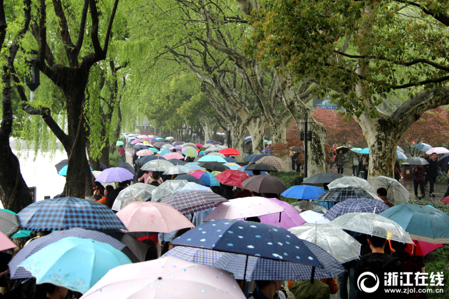 4月5日,清明小長假首日,杭州細雨綿綿,西湖景區游客絡繹不絕。杭城雖降雨降溫,但西湖景區前來賞花踏青的游客如潮,斷橋似人橋。(浙江在線拍友 里爾 柱子 攝)