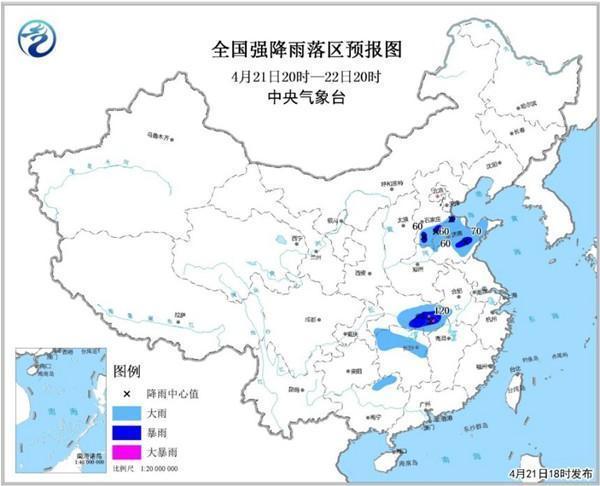 預計4月21日20時至22日20時,河北南部、山東中北部、湖北中東部、湖南北部、廣西北部等地的部分地區有大雨或暴雨,局地有大暴雨(100~120毫米),上述局地并將伴有短時強降水、雷暴大風或冰雹等強對流天氣。