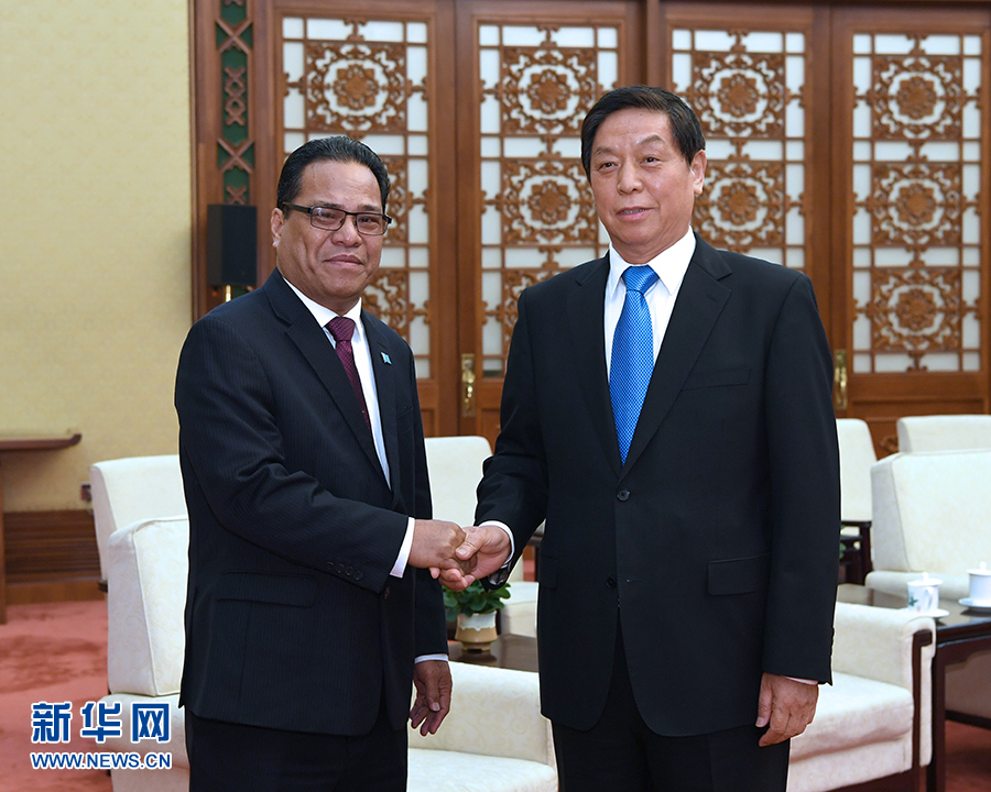 4月23日,全國(guó)人大常委會(huì)委員長(zhǎng)栗戰(zhàn)書在北京人民大會(huì)堂會(huì)見密克羅尼西亞聯(lián)邦國(guó)會(huì)議長(zhǎng)西米納。 新華社記者饒愛民攝