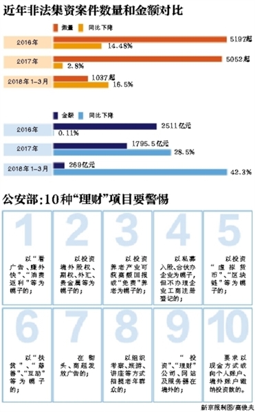 數據顯示,2017年非法集資實現“雙降”。據聯席會議辦公室統計,2017年全國新發涉嫌非法集資案件5052起,涉案金額1795.5億元,同比分別下降2.8%、28.5%,2018年1月至3月,新發非法集資案件1037起,涉案金額269億元,同比分別下降16.5%和42.3%,繼續保持“雙降”態勢。