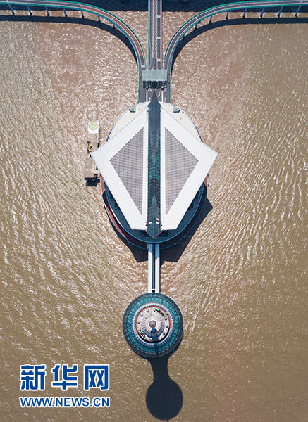 鳥瞰杭州灣跨海大橋海上觀光服務(wù)平臺(tái)(4月19日無人機(jī)航拍)。新華社記者 翁忻旸 攝