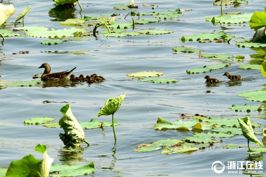 5月15日,西湖斷橋荷塘出現了今年第4窩小鴛鴦,此次共10只。與西湖第1窩時的獨苗相比,此窩可算是一個大家庭, 這讓鴛鴦媽媽忙不過來了。(浙江在線拍友 里爾 攝)