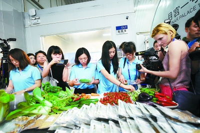 昨天(15日)上午,北京航空航天大學“月宮一號”實驗室,為期365+5天的世界上時間最長的“月宮365”實驗獲得圓滿成功。左圖:4位志愿者從實驗艙走出。上圖:從全密閉實驗艙中帶出的蔬果吸引了眾人的目光。本報記者 和冠欣攝