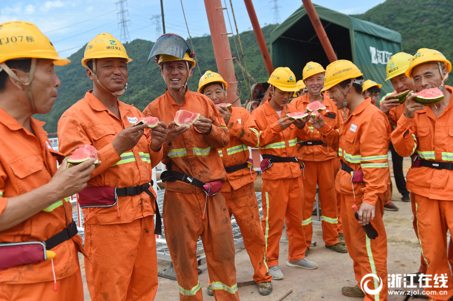 5月16日,杭州持續高溫,最高氣溫達37.5℃。在G25長深高速德清至富陽段擴容工地,工人正在抓緊建設跨富春江大橋。承建施工項目的浙江交工宏途交通建設有限公司,為一線建設者送來了清涼用品和防暑藥品,慰問高溫下作業的施工人員。(浙江在線記者 吳元峰 攝)