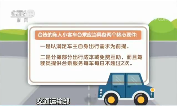 交通運輸部表示,合法的私人小客車合乘應(yīng)當具備兩個核心要件:一是以滿足車主自身出行需求為前提,二是分攤部分出行成本或免費互助,而且駕駛員提供合乘服務(wù)每車每日不超過2次。