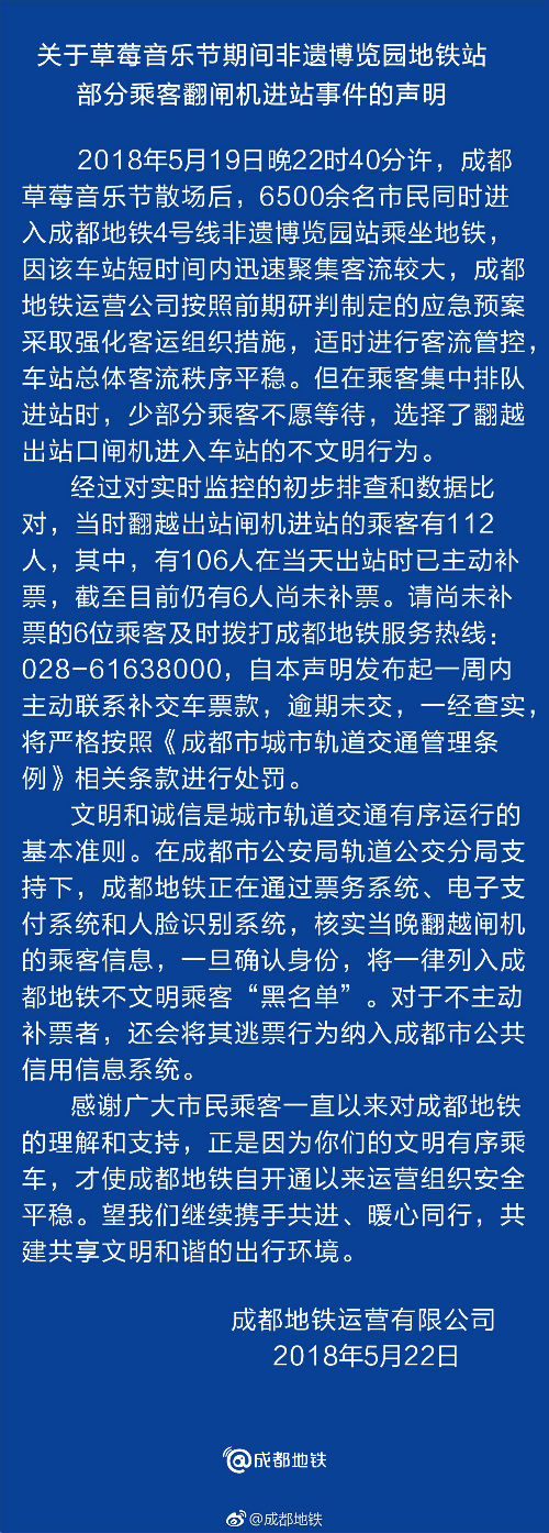 經過對實時監控的初步排查和數據比對,當時翻越出站閘機進站的乘客有112人,其中,有106人在當天出站時已主動補票,截至目前仍有6人尚未補票。請尚未補票的6位乘客及時撥打成都地鐵服務熱線:028-61638000,自本聲明發布起一周內主動聯系補交車票款,逾期未交,一經查實,將嚴格按照《成都市城市軌道交通管理條例》相關條款進行處罰。