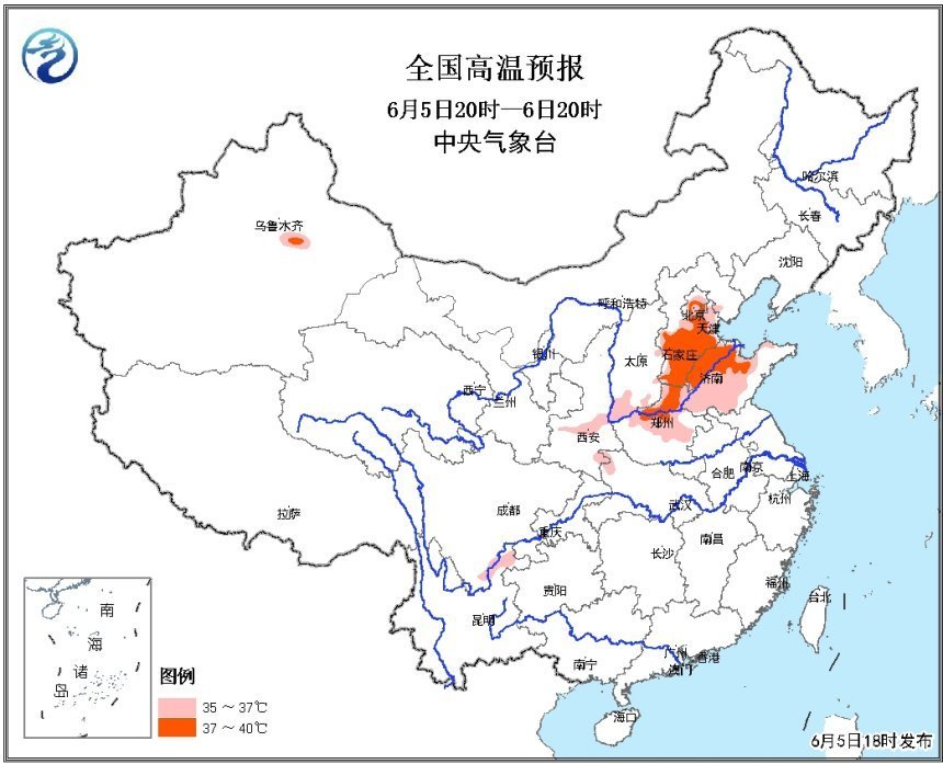 高溫天氣主要影響京津冀地區。5日至6日,北京、天津、河北中南部、山東北部和西部、河南北部以及陜西關中地區最高氣溫可達35℃~38℃,局地可達39℃~40℃。7日,高溫范圍收縮,主要影響河南北部、山東北部等地。