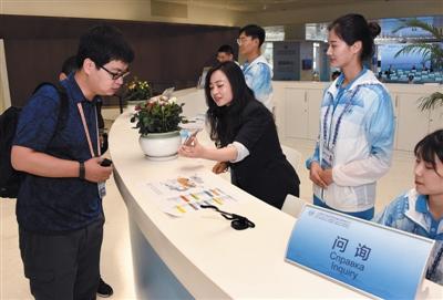 6月1日,志愿者正式上崗,為參會嘉賓、媒體等提供抵離、翻譯、媒體服務、城市運行等全方位、精細化的志愿服務。為了讓志愿服務更加周到貼心,青島還根據(jù)志愿者的個人專業(yè)、特長和意愿進行了分組。在新聞中心,就有300多名志愿者。
