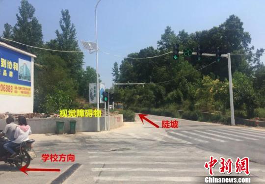 14日中午,記者趕至事發(fā)現(xiàn)場時(shí)發(fā)現(xiàn),事故發(fā)生的路口距離學(xué)校大門不足100米,挨著學(xué)校紅綠燈的左側(cè)路口是一陡坡,而且存在一定的視覺盲區(qū),極易發(fā)生交通事故。