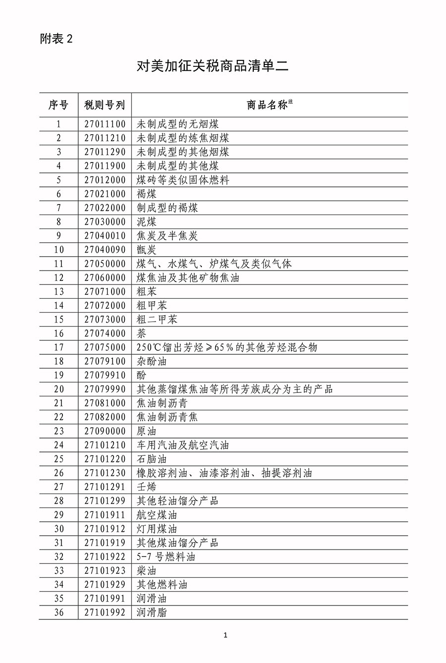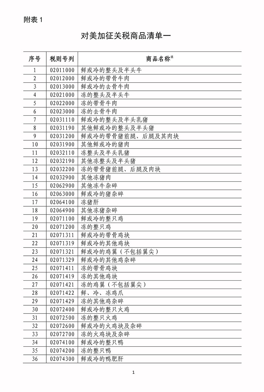 附表1 對美加征關稅商品清單一