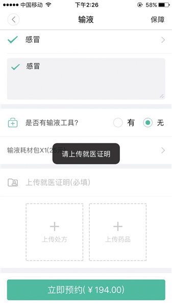 某“共享護士”平臺要求預約時提供就醫證明,但記者提供虛假資料也能通過審核。 手機截圖