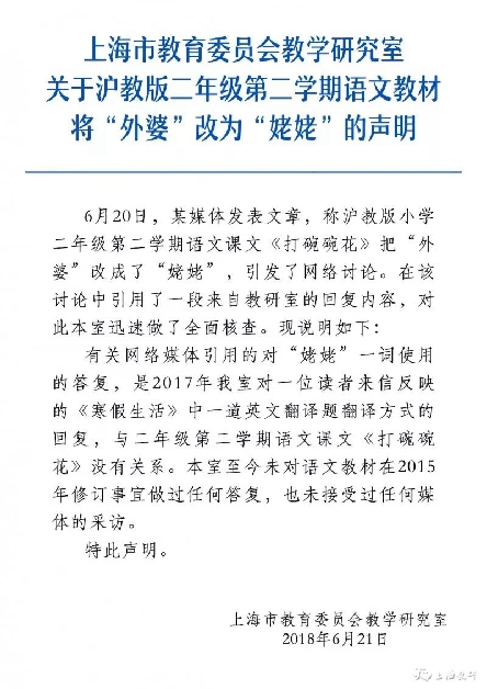 上海市教育委員會(huì)教學(xué)研究室今日發(fā)表關(guān)于滬教版二年級(jí)第二學(xué)期語文教材將“外婆”改為“姥姥”的聲明。聲明稱,網(wǎng)絡(luò)媒體引用的答復(fù),是2017年研究室對(duì)一位讀者來信反映的一道英文翻譯題翻譯方式的回復(fù),與二年級(jí)第二學(xué)期語文課文《打碗碗花》沒有關(guān)系。