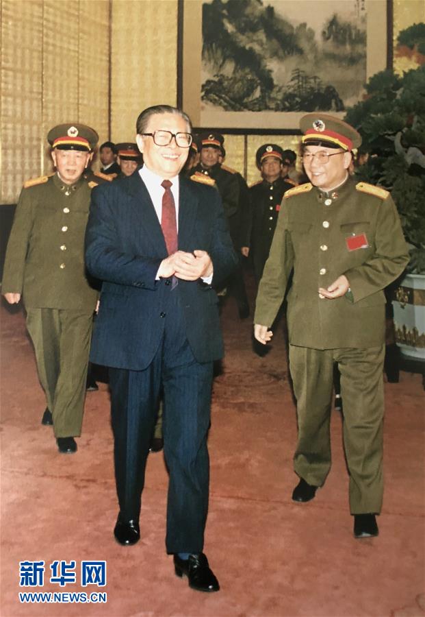 1990年12月,趙南起同志陪同江澤民同志接見全軍后勤工作會議代表。新華社發