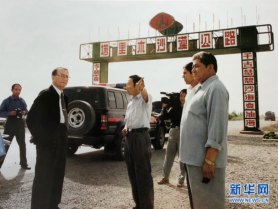 1999年,趙南起同志率全國政協防治荒漠化調研組在新疆塔里木沙漠公路調研。新華社發