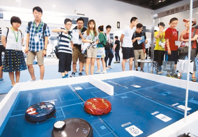 參觀者在北京國(guó)際消費(fèi)電子博覽會(huì)上觀看掃地機(jī)器人。 陳曉根攝(人民圖片)