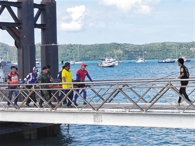7月6日,泰國(guó)普吉島查龍碼頭,打撈船換成軍艦,船只無(wú)法靠岸更換碼頭,警察撤離該碼頭。 通訊員 卜志輝 攝