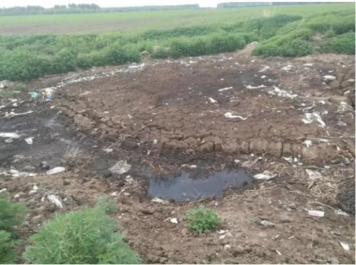 污染防治設施失效。按照環評要求,養殖場采用水泡糞工藝,每天產生糞便約30噸,尿液加沖洗水380噸,糞尿通過污水廠處理后達標排放;每天產生固體廢棄物約3.8噸,外運周邊農戶作為有機肥使用。但長期以來,企業污染防治措施名存實亡。2018年5月,肇東市環保局對該企業檢查時發現,污水處理廠從2018年2月起擅自停止運行;污水暫存池防滲膜破損嚴重,并向周邊草原偷排大量高濃度廢水,廢水化學需氧量濃度高達3700mg/L。當地雖對企業進行了處罰,但直至督察進駐時,企業超標排污仍然進行。