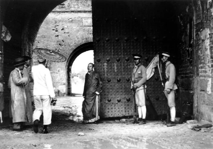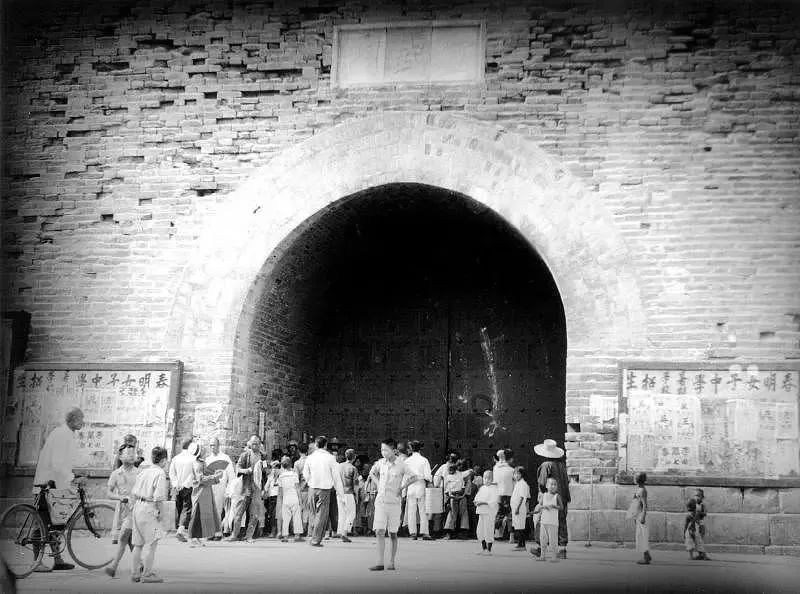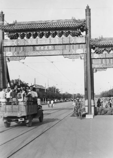 盧溝橋事變后的第二天,宛平城門口警戒的士兵和入城的民眾