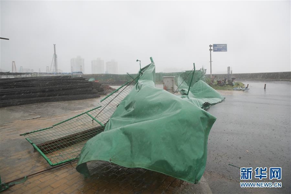 7月22日,在上海吳淞口國際郵輪碼頭,岸邊的防護欄被大風吹垮。據(jù)上海中心氣象臺消息,今年第10號臺風“安比”(強熱帶風暴級)的中心已于7月22日12時30分在上海崇明東部登陸,登陸時中心附近最大風力有10級(28米/秒),中心最低氣壓982百帕,登陸后繼續(xù)向西北方向移動,強度逐漸減弱。新華社記者丁汀攝