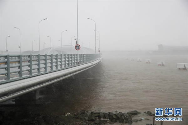 7月22日,在上海吳淞口國際郵輪碼頭,雨水沖刷著大橋。新華社記者丁汀攝