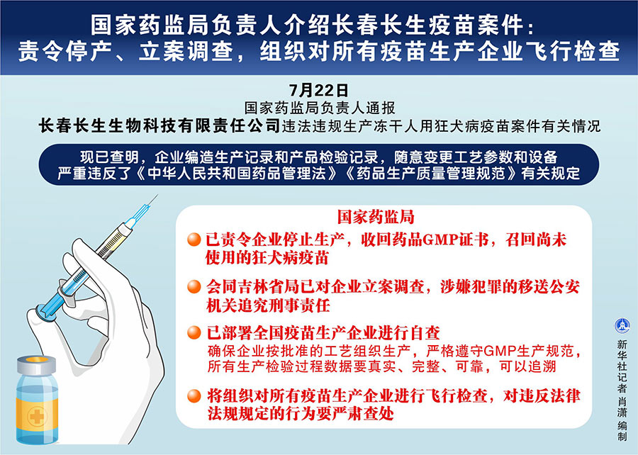 他說,現(xiàn)已查明,企業(yè)編造生產(chǎn)記錄和產(chǎn)品檢驗記錄,隨意變更工藝參數(shù)和設備。上述行為嚴重違反了《中華人民共和國藥品管理法》《藥品生產(chǎn)質(zhì)量管理規(guī)范》有關規(guī)定,國家藥監(jiān)局已責令企業(yè)停止生產(chǎn),收回藥品GMP證書,召回尚未使用的狂犬病疫苗。國家藥監(jiān)局會同吉林省局已對企業(yè)立案調(diào)查,涉嫌犯罪的移送公安機關追究刑事責任。