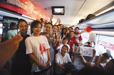 8月1日,乘客與乘務員在京津城際復興號列車內合影。新京報記者 王貴彬 攝