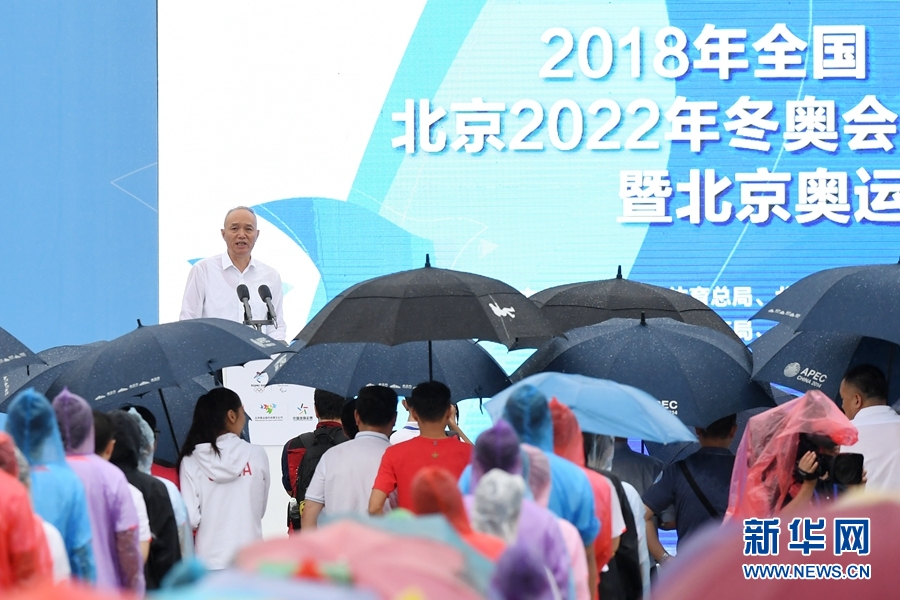 北京市委書記、北京冬奧組委主席蔡奇出席活動并宣布:“2018年全國‘全民健身日’主會場活動開始,2022年北京冬奧會和冬殘奧會吉祥物全球征集發(fā)布啟動。”