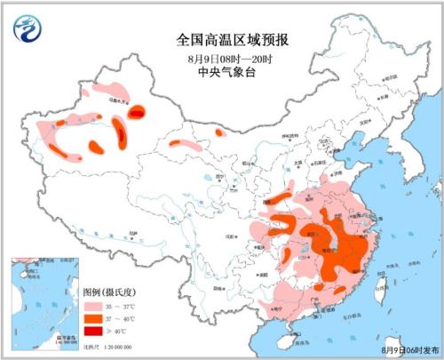 據中央氣象臺網站消息,中央氣象臺8月9日06時繼續發布高溫黃色預警:預計8月9日白天,陜西中南部、黃淮大部、江淮、江漢、四川盆地東北部、江南大部、華南中東部、甘肅西部及新疆南疆盆地和沿天山一帶等地的最高氣溫有35~36℃。