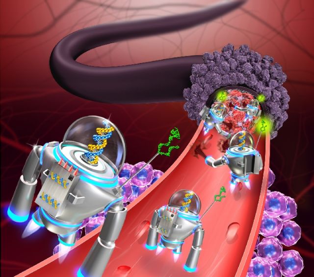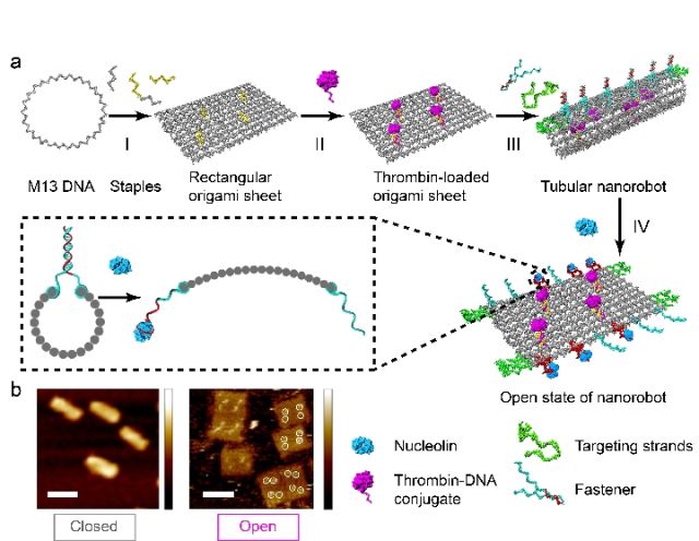 該團(tuán)隊(duì)的丁寶全研究員通過精準(zhǔn)控制,將一種包含7000多個(gè)堿基的噬菌體的DNA單鏈分子折成長方形板,放上四個(gè)“殺手”——凝血酶分子,然后再將其卷起來,接口處安裝用核仁素DNA片段做的“鎖”,最終形成90納米長、直徑為19納米的管狀機(jī)器人。